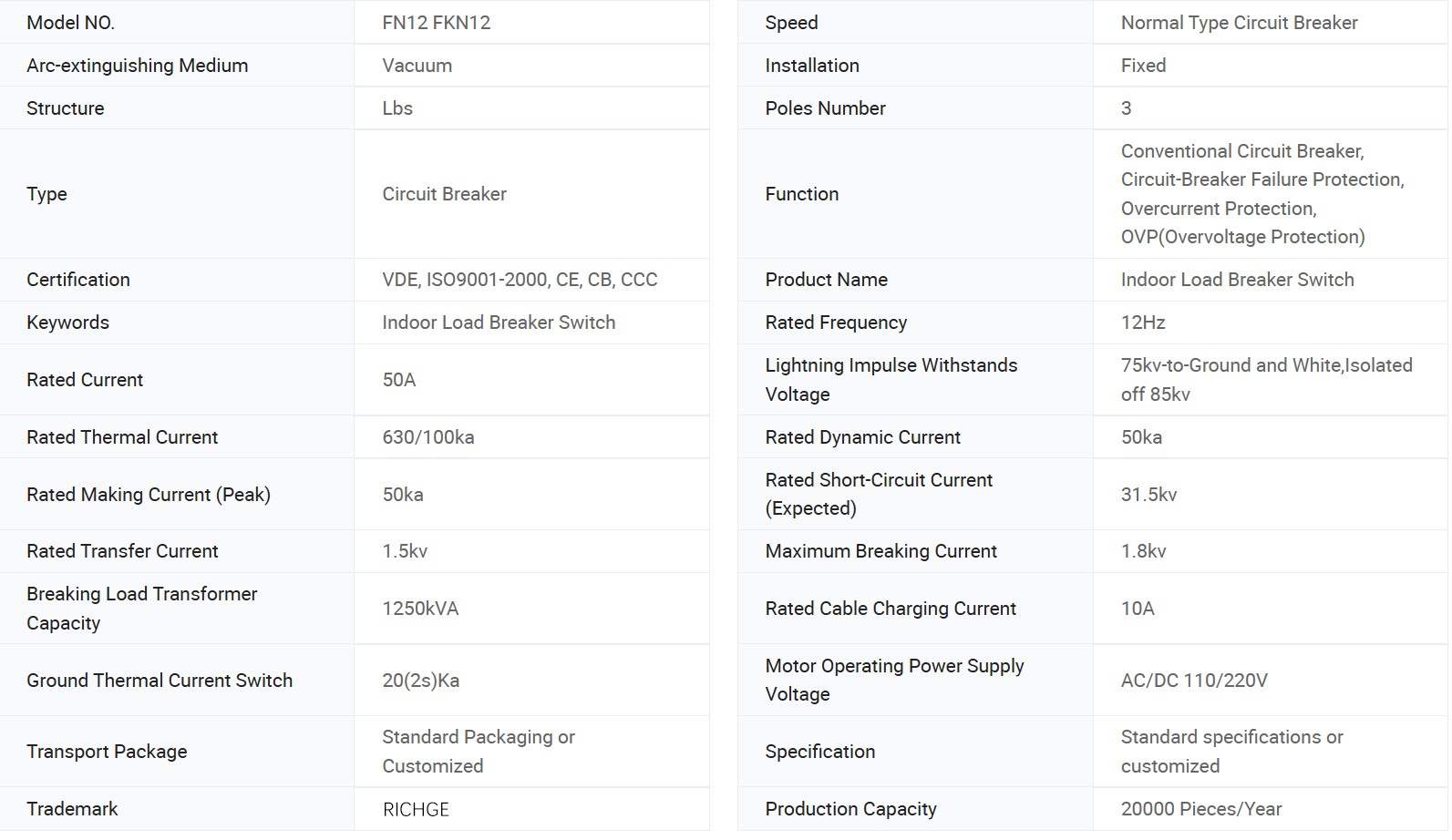 Vnútorný striedavý vysokonapäťový záťažový spínač FKN12-12D/630-20 je trojfázový vysokonapäťový rozvádzač s menovitým napätím 12KV a menovitou frekvenciou 50HZ. Používa sa na spínanie prúdu záťaže, prúdu v uzavretej slučke, transformátora naprázdno a nabíjacieho prúdu kábla, vypnutia kombinovaného skratového prúdu. Spínač záťaže vybavený uzemňovacím spínačom odolá skratovému prúdu.