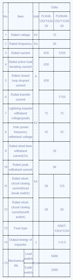 Technické parametre FLN48-12D typu vnútorná HV SF6 ZAMESTNENIE