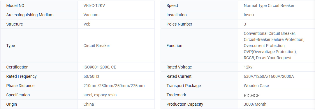 VBI-12 VCB zvyčajne pripevnené do panela rozvádzača Kyn28 a XGN. Je použiteľný v príležitostiach s častou prevádzkou, má funkcie vysokorýchlostného reklosača, viacnásobné otváracie/zatváracie, spoľahlivé mechanické blokovanie. Má pevný typ typu a výberu.