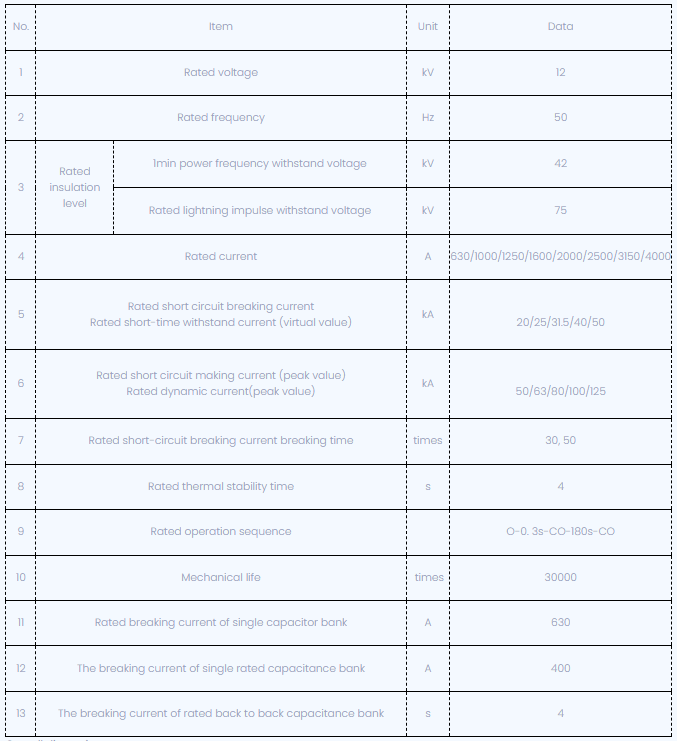 Technické parametre VSG-12 1600A VCB pevné typy pevného pólu